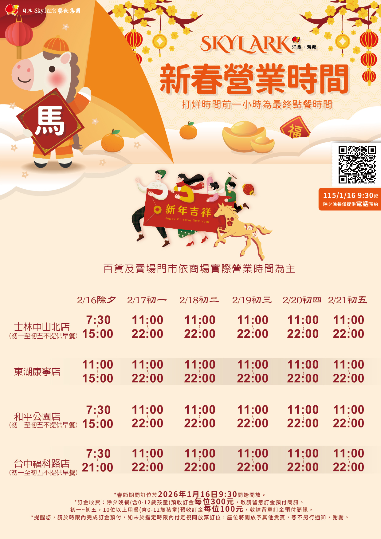 * 春節期間訂位於2026年1月16日9:30開始開放。