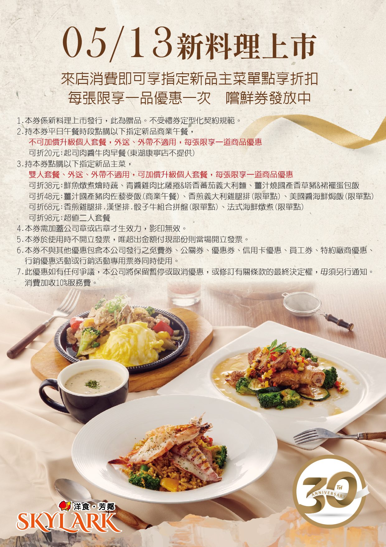 3.持本券點購以下指定新品主菜,雙人套餐、外送、外帶不適用,可加價升級個人套餐,每張限享一道商品優惠