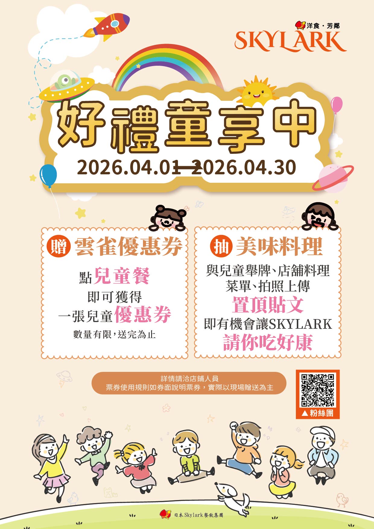 即可獲得雲雀國際【兒童三重優惠券】乙張